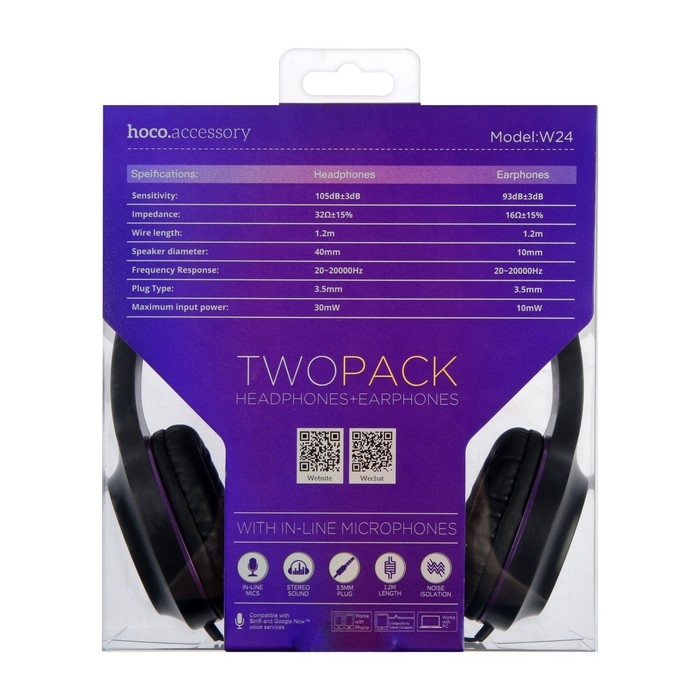 Комплект наушников Hoco W24, проводные, накладные + вакуумные, проводные, фиолетовые