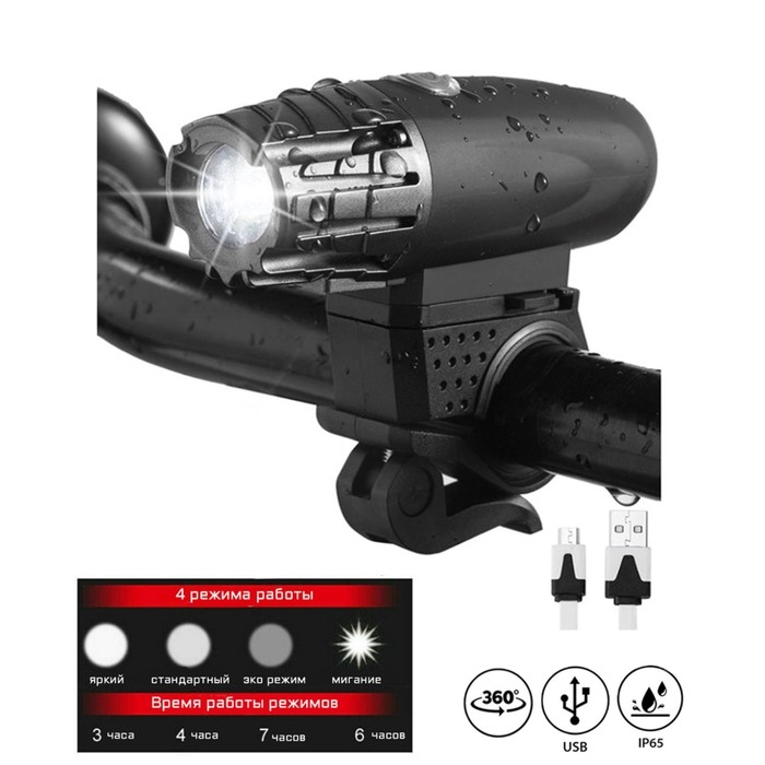 Фонарь велосипедный передний аккумуляторный, водонепроницаемый, 1 диод, 4 режима