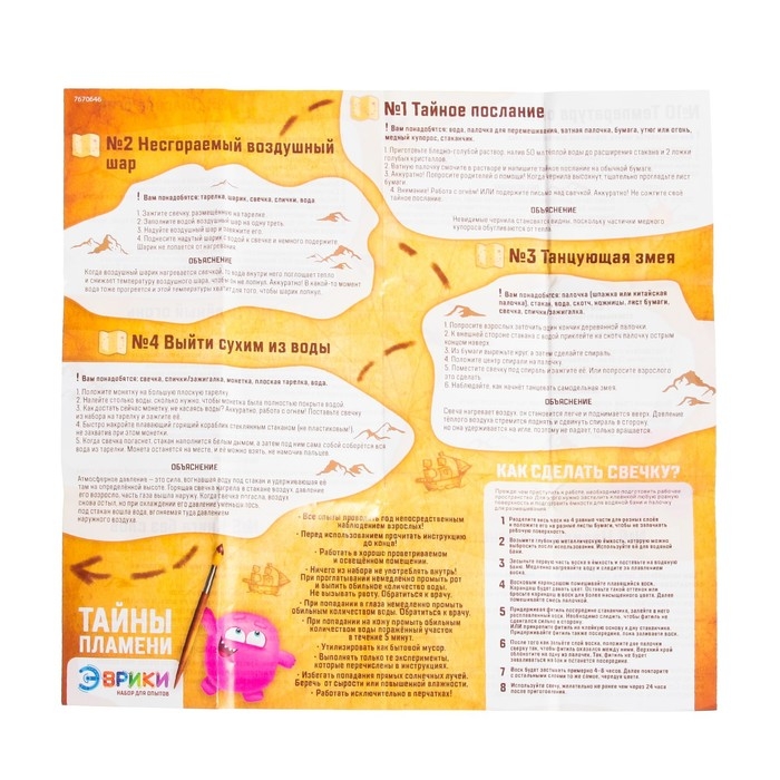 Прежде чем приступать к экспериментам, необходимо подготовить рабочее пространство. В инструкции есть пошаговое описание, как создать свечку, которая вам понадобится для проведения экспериментов. Каждый опыт имеет пошаговую инструкцию и объяснения.