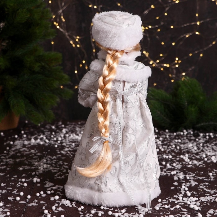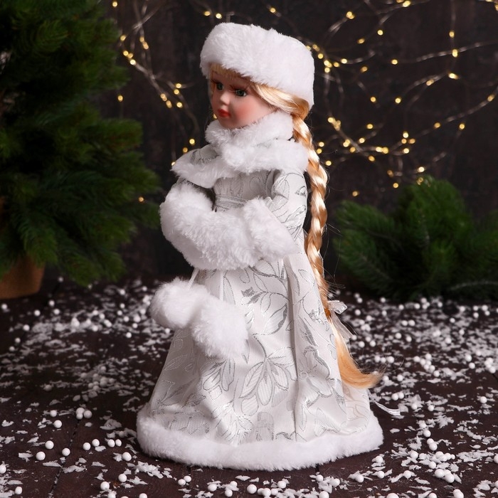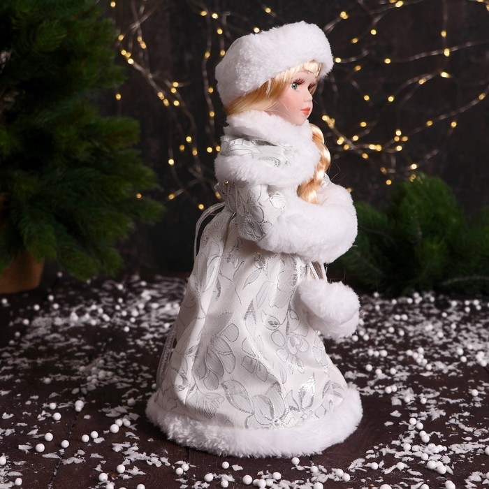Снегурочка "В муфте с меховыми бомбошками" 33 см, серебристо-белый