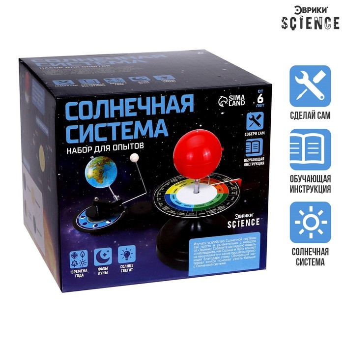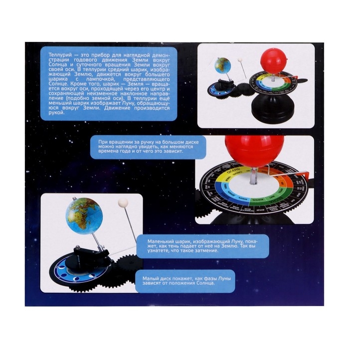 Набор для опытов «Эврики» отправит юного исследователя в далёкое путешествие в космос! Ребёнок соберёт теллурий — прибор для наглядной демонстрации годового движения Земли вокруг Солнца и суточного вращения Земли вокруг своей оси.