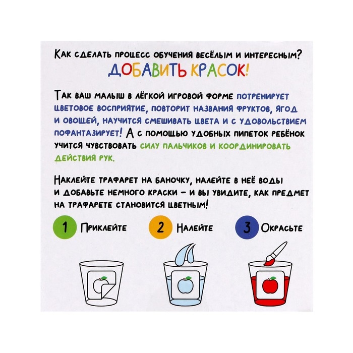 - Дайте малышу задание определить, какого цвета фрукт, и раскрасить его. А как это сделать? Просто добавить пипеткой нужную краску в баночку с трафаретом.