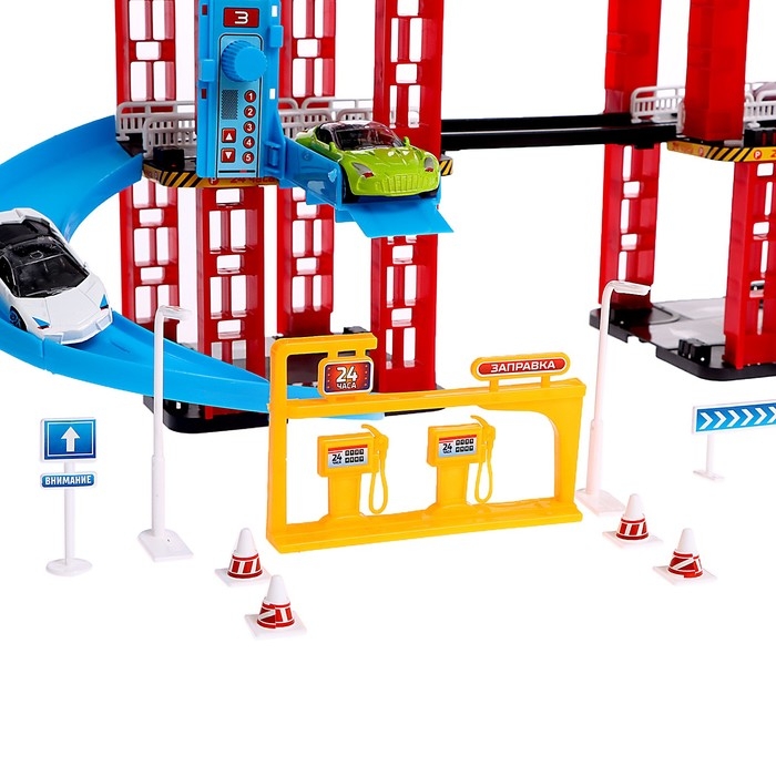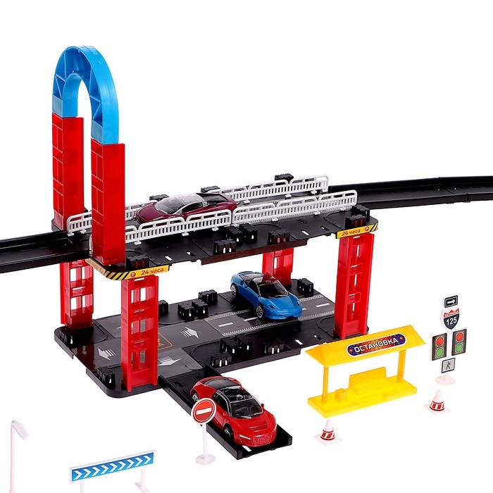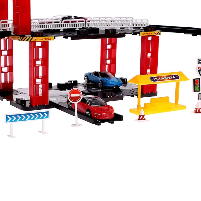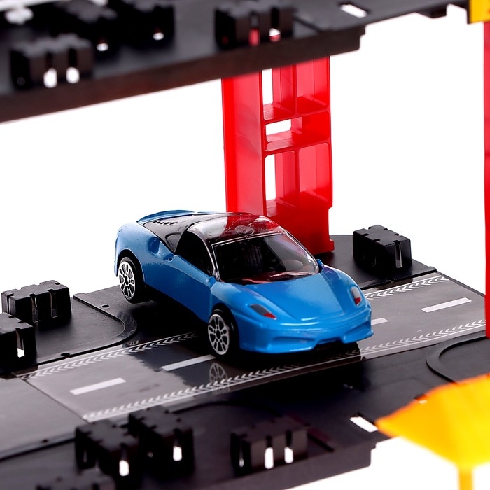 Сам автотрек оснащён многоуровневыми пандусами, парковочными зонами и знаками дорожного движения.