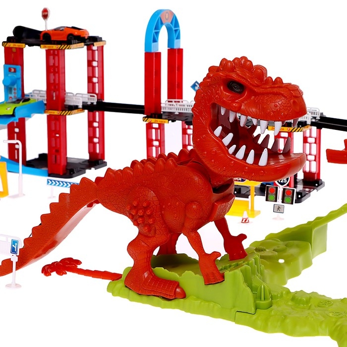 Соберите трассу и запускайте автомобили. Скатываясь по дороге, они будут попадать то в пасть к динозавру, то проезжать под его хвостом — мальчишка будет в восторге. Регулируя высоту дороги или отправляя машинки в полёт катапультой, можно просчитать, куда они приземлятся.