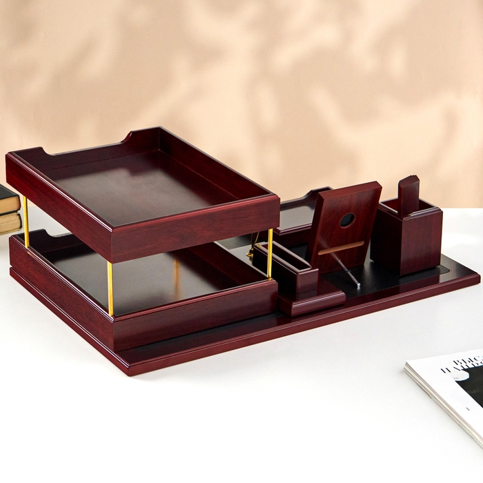 Компактный настольный набор поможет избежать хаоса на рабочем месте. Храните в нём канцелярские принадлежности или другие мелочи, чтобы правильно организовать пространство. К тому же изделие имеет минималистичный дизайн и выполнено под дерево, поэтому оно украсит собой любое место как декоративный элемент.
