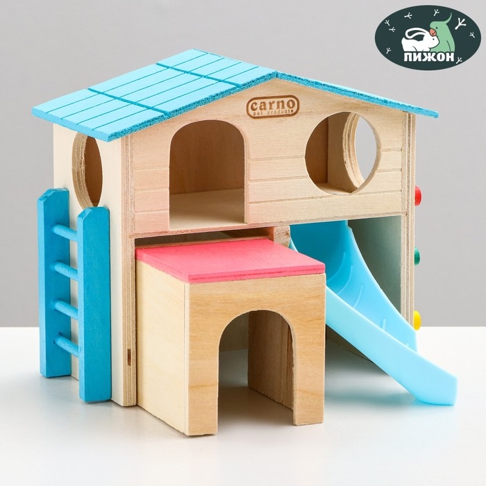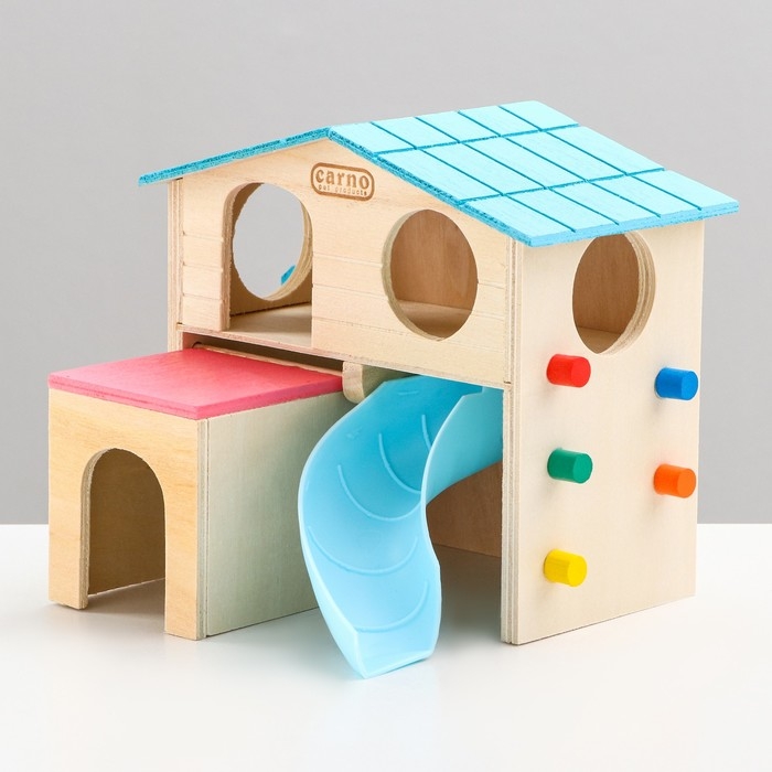 Домик также оснащен горкой, лесенкой и скалодромом для поддержания физического здоровья питомца.