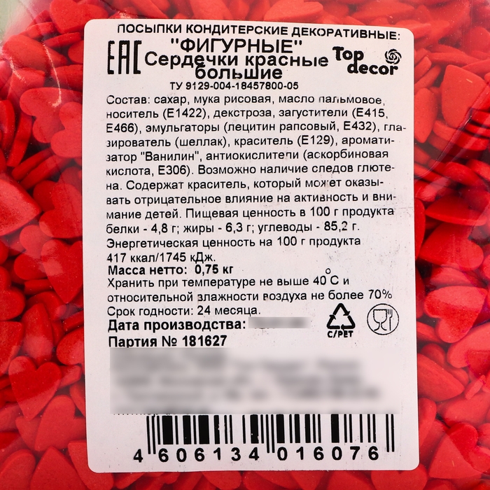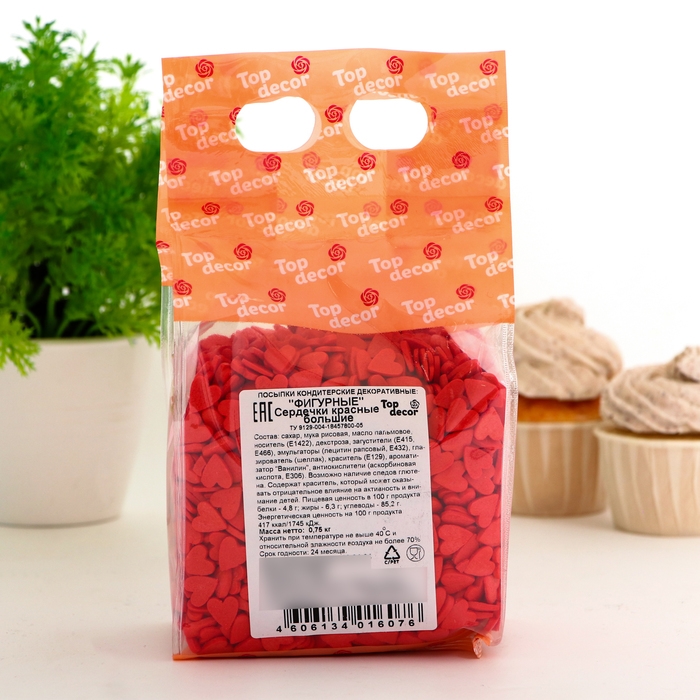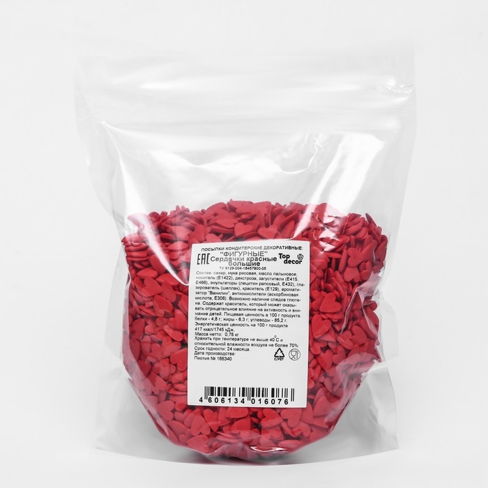 Кондитерская посыпка Top decor, "Сердечки", красные, большие, 750 г