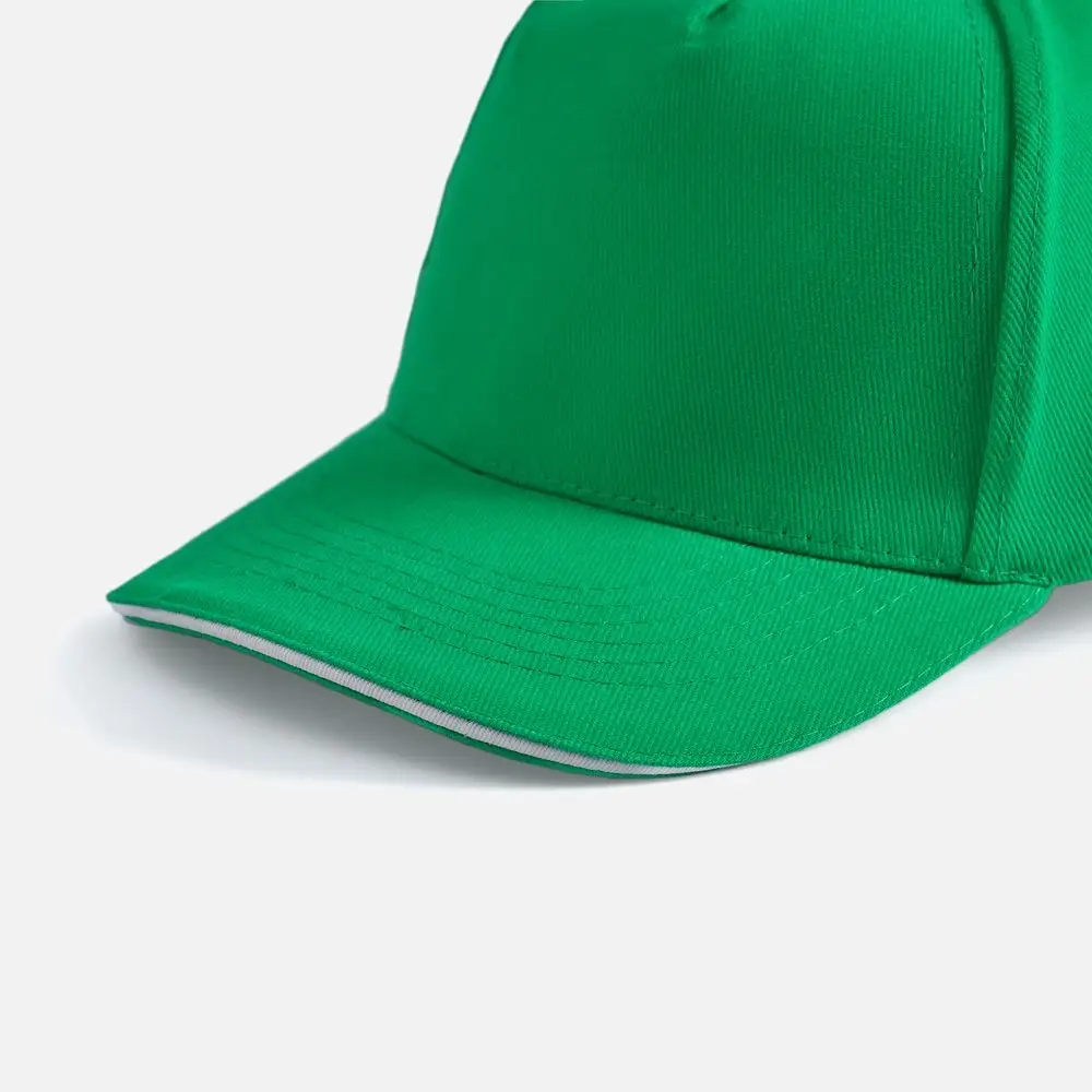 Модель бейсболки с 5-ю клиньями без лобового шва из плотного чесаного хлопка.