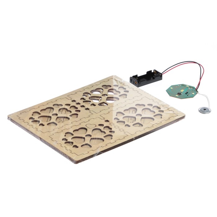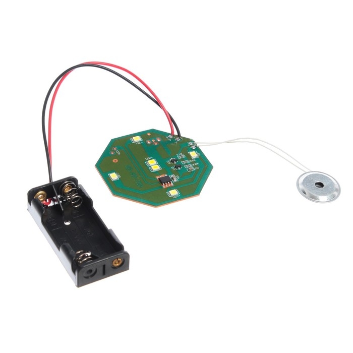 В электрической цепи есть микрофон, он улавливает звуки, преобразует их в электрический сигнал и передаёт на плату управления. Это позволяет включать и выключать лампочки.