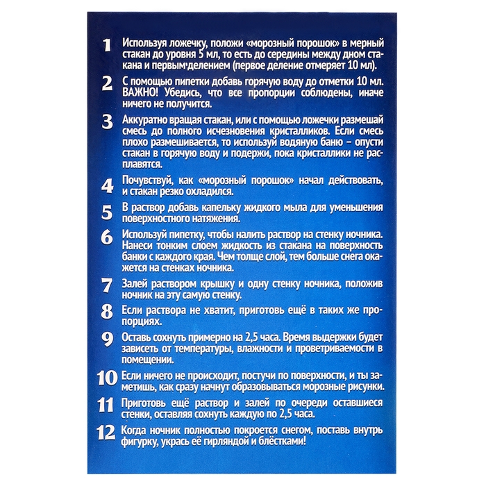 - В мерном стакане смешайте 2 г морозного порошка и 10 мл горячей воды.