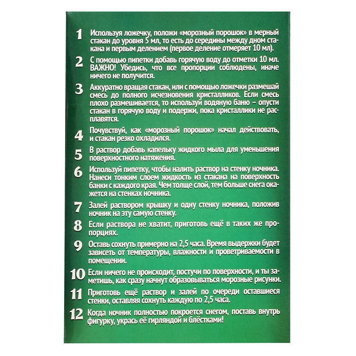 - В мерном стакане смешайте 2 г морозного порошка и 10 мл горячей воды.