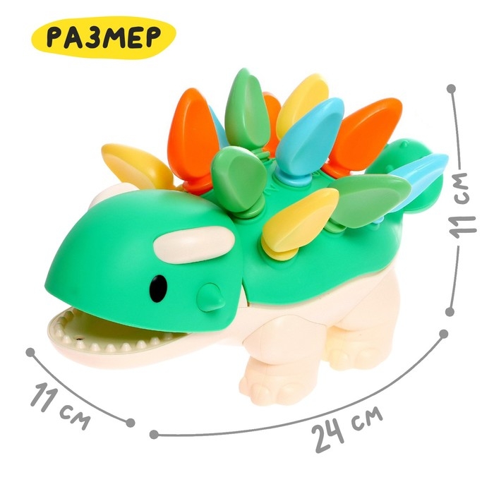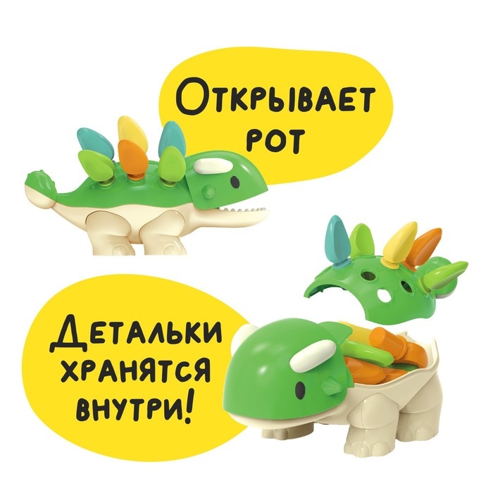 Внутри вы найдёте забавного динозаврика, 12 шипов и 2 кубика для занятий.