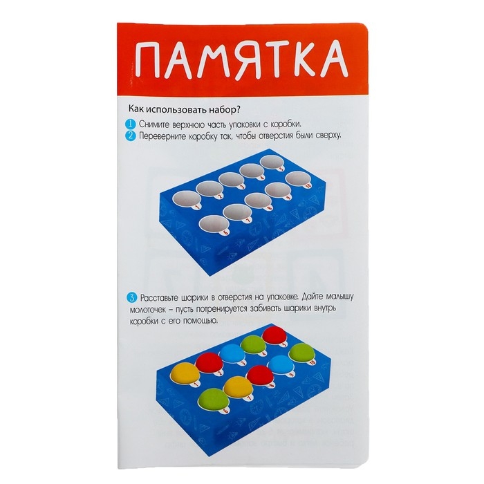 - Разложите шарики в отверстия коробочки. Дайте малышу молоточек — пусть потренируется забивать шарики внутрь коробки.