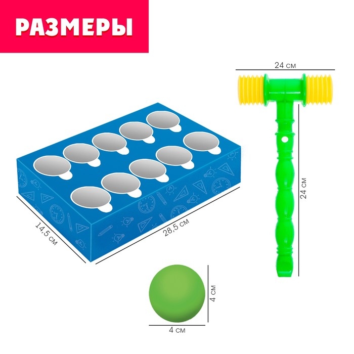 - Задача малыша — ударить молоточком по мячику с той цифрой, которая совпадает с правильным ответом.