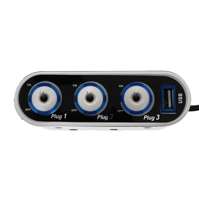Разветвитель прикуривателя, 3 гнезда, 2 USB 1 А, 60 Вт, 12/24 В, подсветка, провод 70 см