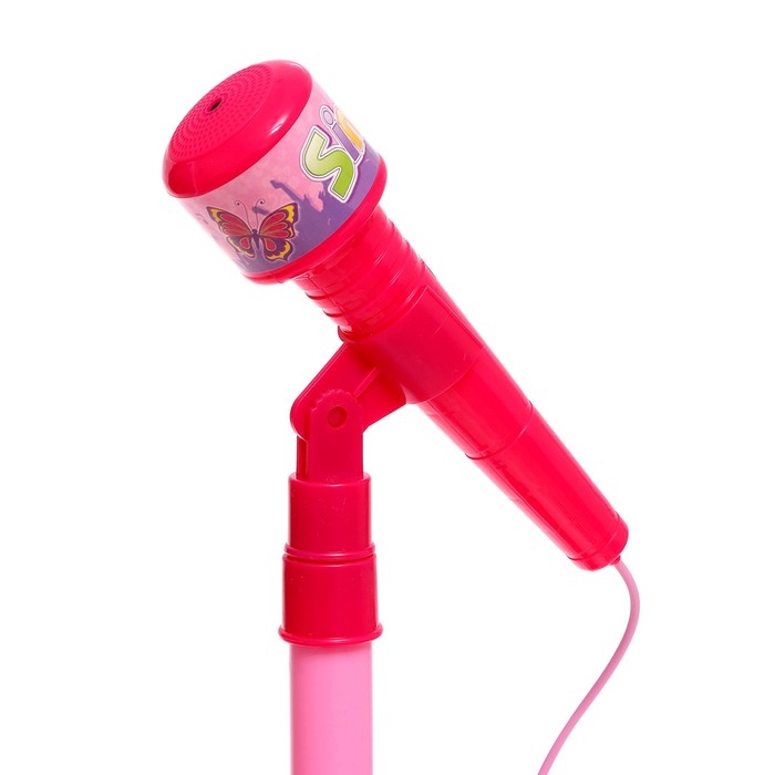 - Высота стойки микрофона регулируется, это даёт возможность подстраивать её под рост малыша. Максимальная высота — 120 см, минимальная — 80 см. Микрофон усиливает звук.