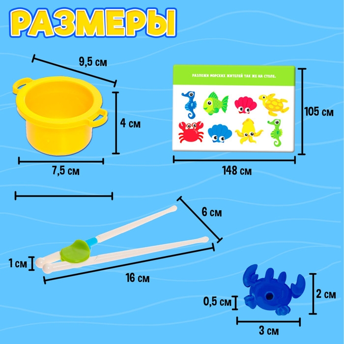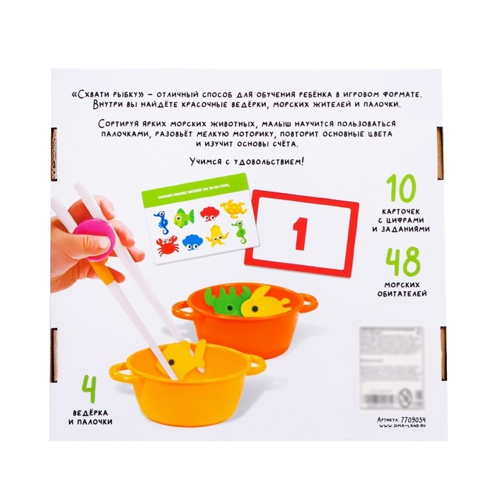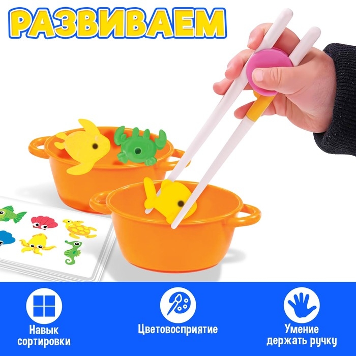 Развивающий сортер «Схвати рыбку» — эффективный способ обучения ребёнка в игровом формате. Внутри вы найдёте красочные ведёрки, морских жителей и палочки.