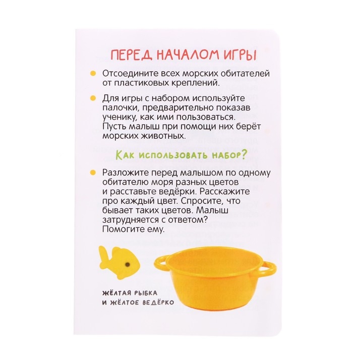 - Задача ребёнка — с помощью палочек сортировать обитателей в ведёрки подходящего цвета.