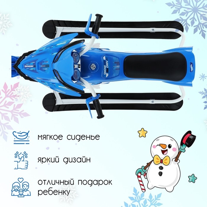 Снегокат предназначен для перевозки детей по снегу или льду, катания с горок. Оснащён пластмассовыми лыжами и мягким сиденьем, обтянутым искусственной кожей. Оборудован буксировочным тросом с автоматической намоткой и системой амортизации, которая обеспечивает комфортную поездку по крутым горкам и неровным поверхностям. Тормоз эффективен на обледенелой поверхности.