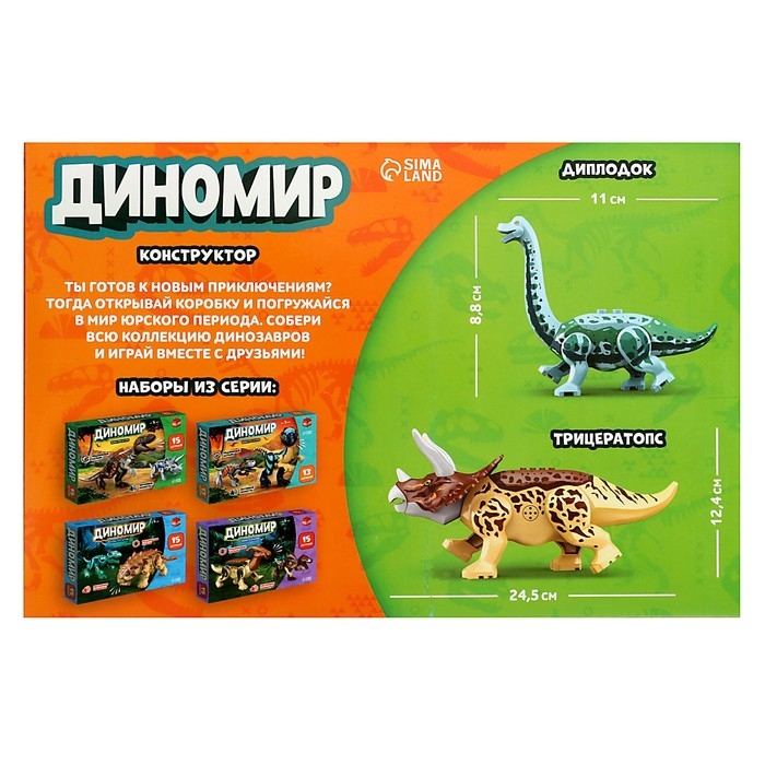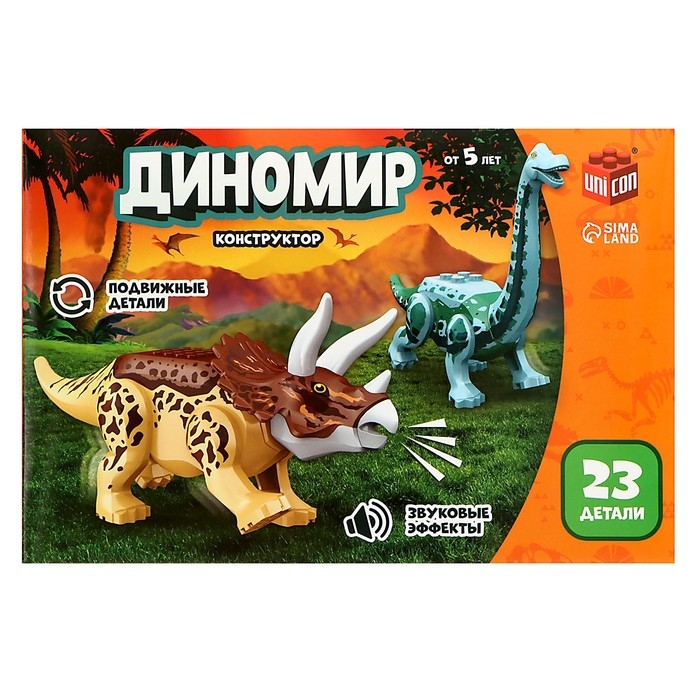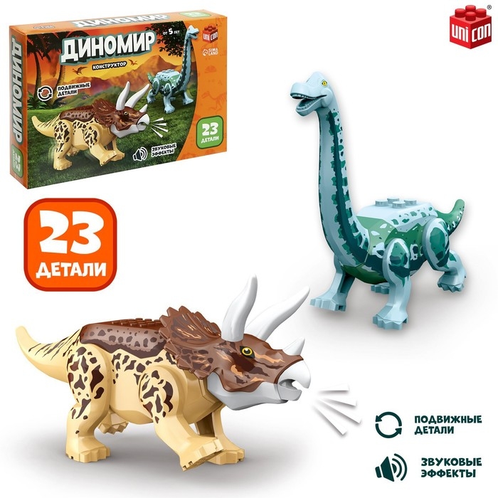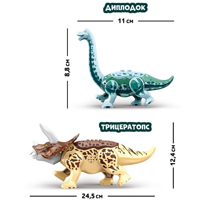 Конструктор «Диномир», трицератопс и диплодок, звуковые эффекты, 23 детали