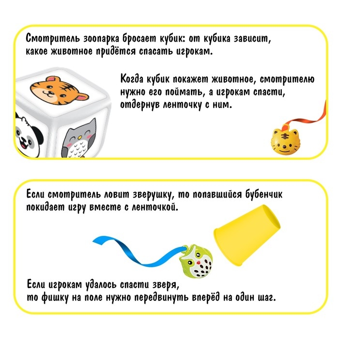 - Когда кубик покажет животное, смотрителю нужно его поймать, а игрокам спасти, отдёрнув ленточку с ним.