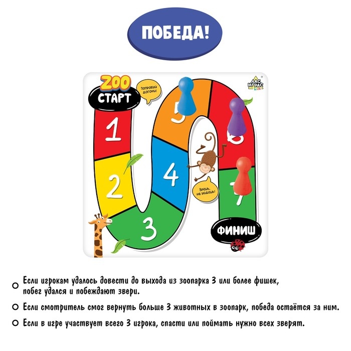 - Если игрокам удалось довести до выхода из зоопарка 3 или более фишек, побег удался и побеждают звери.