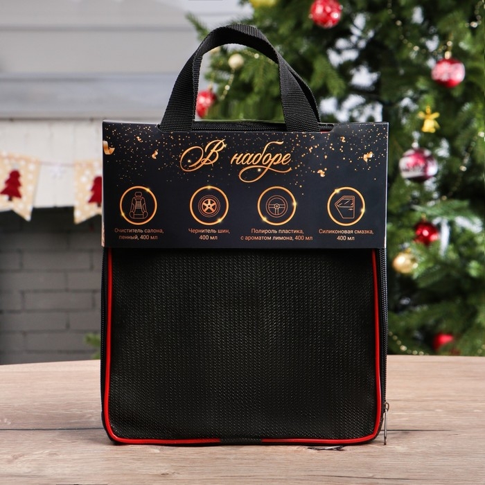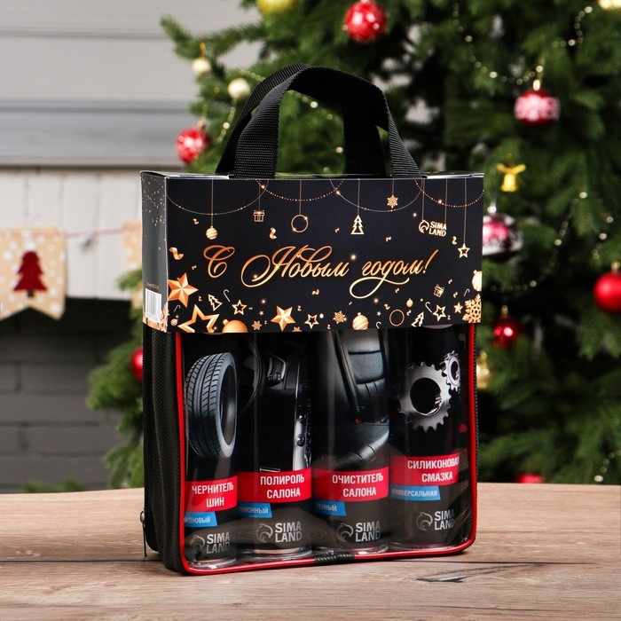 Новогодний подарочный набор для ухода за авто "С новым годом!", набор автохимии: силиконовая смазка 400 мл, полироль пластика 400 мл, очиститель салона 400 мл, чернитель шин 400 мл + микрофибра
