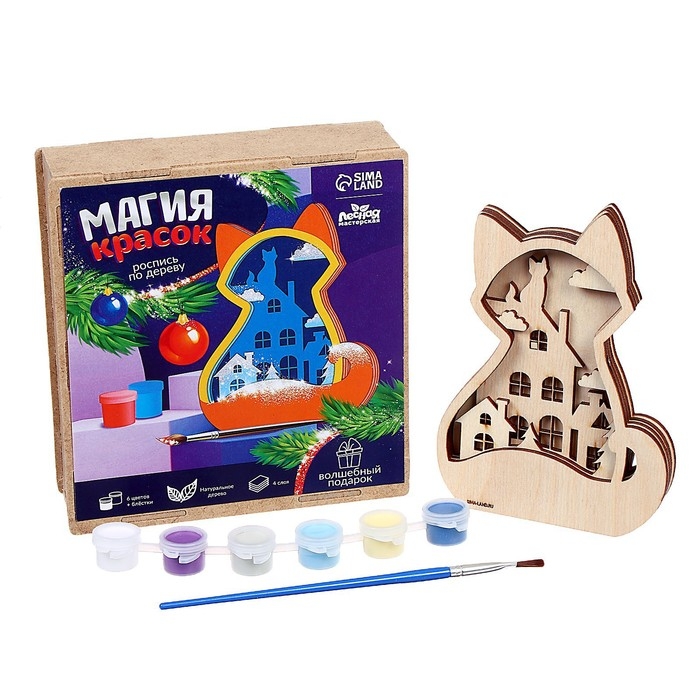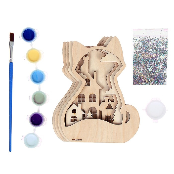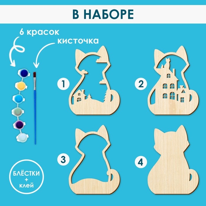 - В комплект входят деревянные заготовки, краски, блёстки и кисточка.