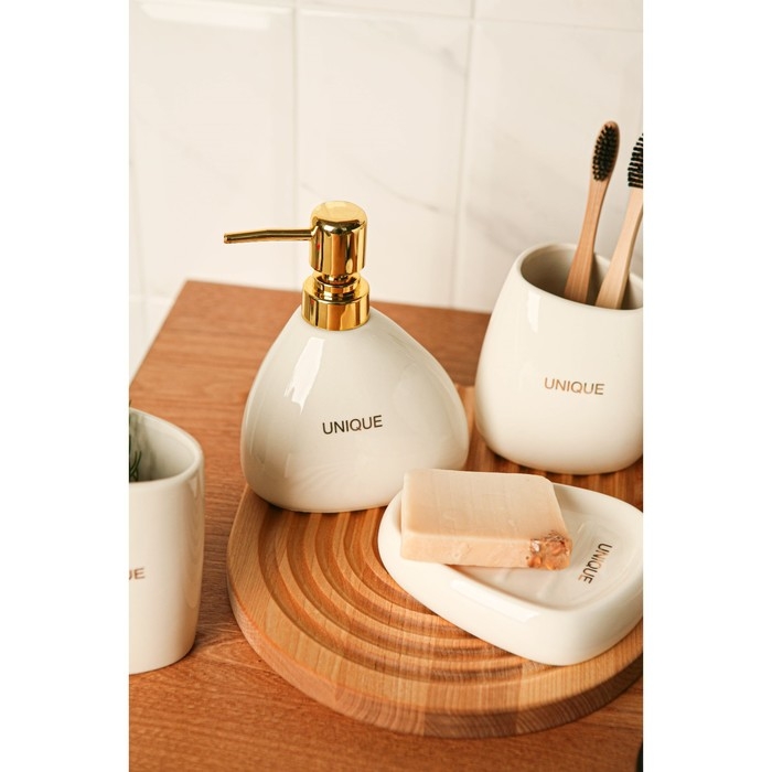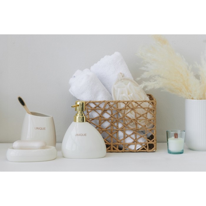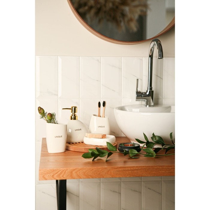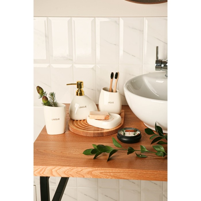 Каждый элемент набора продуман до мелочей: мыльница размером 13х10х2,9 см, дозатор для мыла объемом 400 мл и два стакана различных размеров (410 мл и 300 мл), которые идеально дополняют друг друга, создавая гармоничный ансамбль.