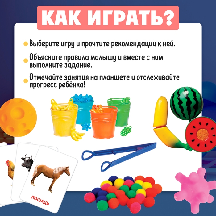 В большой набор входит 7 игр, основанных на различных методиках всестороннего развития. К каждой игре прилагаются подробные рекомендации по использованию с описанием, полезными заданиями и упражнениями. Игры в наборе направлены на развитие важных навыков ребёнка с учётом его потребностей.