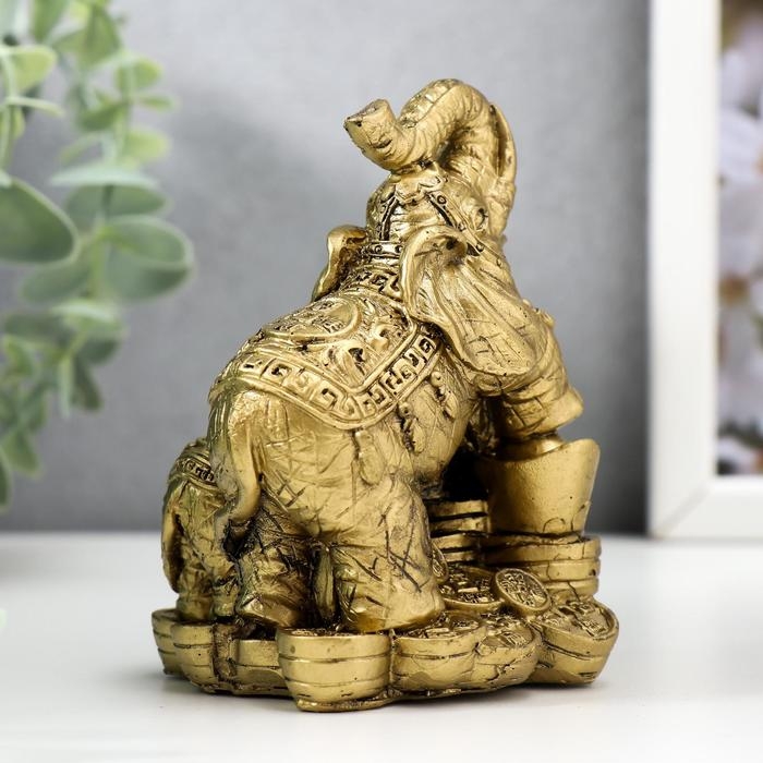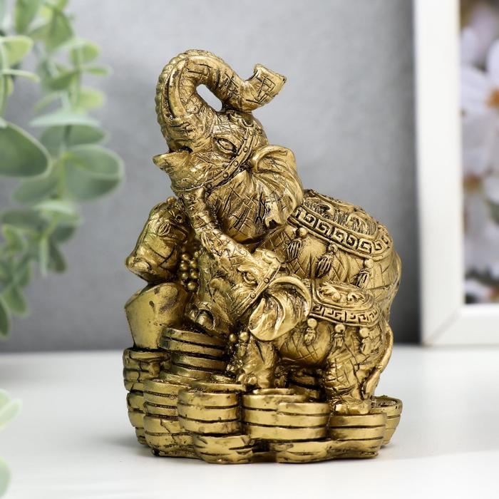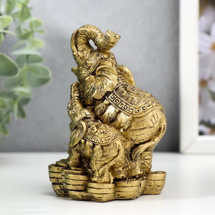 Нэцке полистоун под бронзу "Слон со слоненком - хоботы вверх, на монетах" 10х7,2х6,8 см