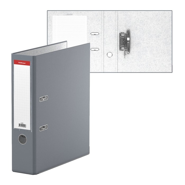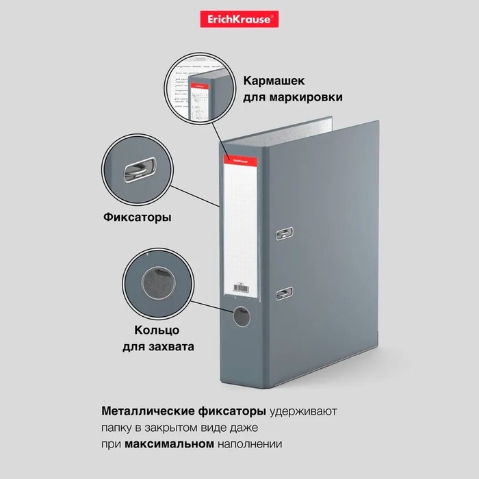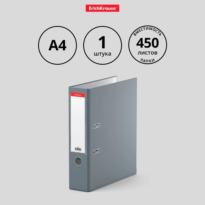 Папка-регистратор А4, 70 мм, ErichKrause "Бизнес", собранный, серый, пластиковый карман, металлический кант, картон 2мм, вместимость 450 листов