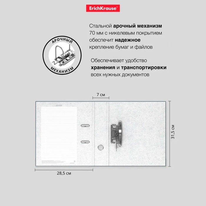 Папка-регистратор формата А4 снабжена стальным арочным механизмом с никелевым покрытием.