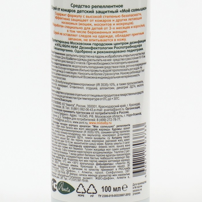 Безопасный состав разработан специально для малышей с 3-х месяцев. Подходит взрослым. Разрешено использовать женщинам в период беременности. Эффективно защищает от укусов комаров и других летающих насекомых (москитов, мокрецов, мошек). Не оставляет следов на одежде, обладает приятным запахом, не впитывается в кожу.Состав: Этилбутилцетил аминопропионат (IR 3535) -10%, а также пропиленгликоль, эмульгатор, консервант, D-пантенол,отдушка, аллантоин, динатрий ЭДТА, кислота лимонная, вода. Рекомендации по применениюРаспылить средство на ладонь и обработать открытые участки лица и тела, не втирая. Для обработки одежды распылить на нее средство на расстоянии 10-15 см. Время защитного действия до 2-х часов. При необходимости повторить.