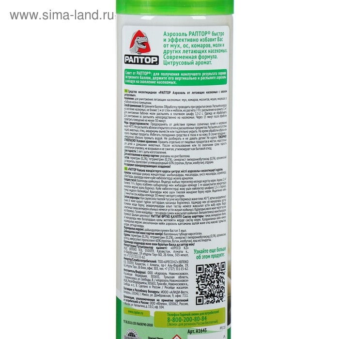 Аэрозоль от летающих насекомых РАПТОР Цитрус 275 мл 12649 A1643 защищает от комаров, мух, ос и т.д.Средство не содержит озоноразрушающих веществ.Имеет приятный аромат апельсина. Состав: перметрин – 0,2%, тетраметрин – 0,1%, синергист – 0,5%, растворитель углеводородный, пропеллент: бутан/пропан/изобутан