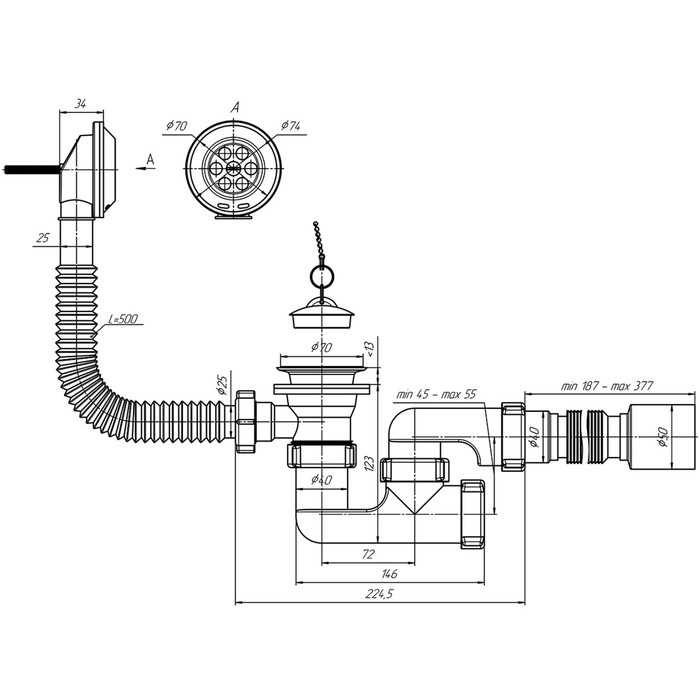 - Решетка слива: Ø70мм при выпуске 1½.