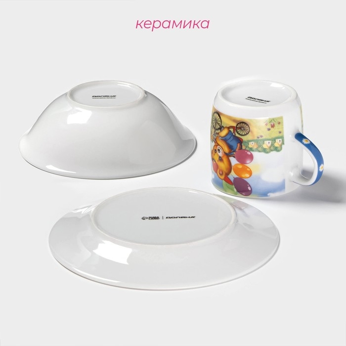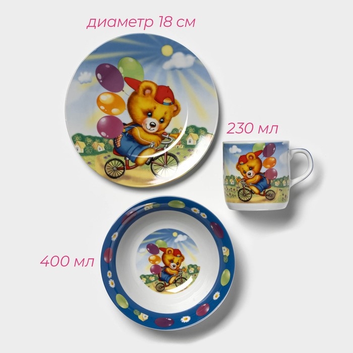 Набор детской посуды из керамики Доляна «Мишка на велосипеде», 3 предмета: кружка 230 мл, миска 400 мл, тарелка d=18 см