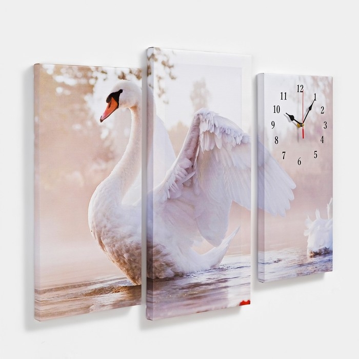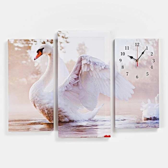 Часы-картина настенные, модульные, "Белый лебедь на пруду", бесшумные, 60 х 80 см, триптих