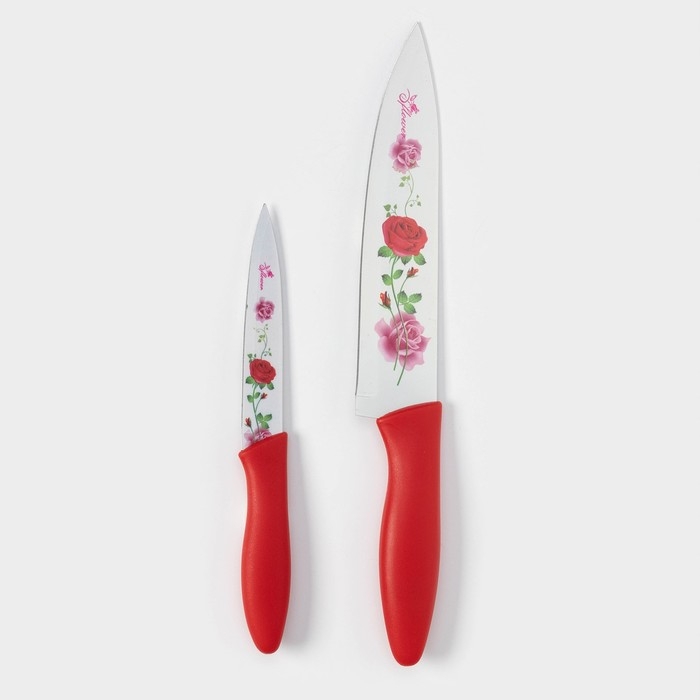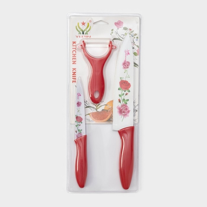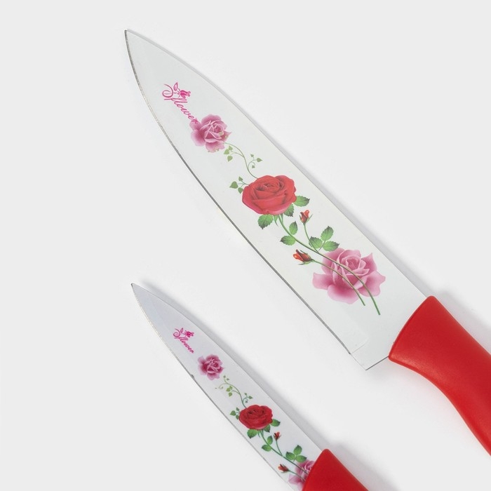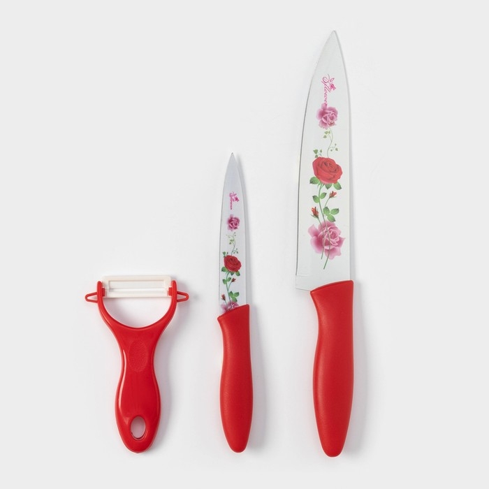 Набор кухонных принадлежностей Доляна «Нарцисс», 3 предмета: 2 ножа с антиналипающим покрытием, лезвие 12 см, овощечистка, 20×4 см, цвет красный