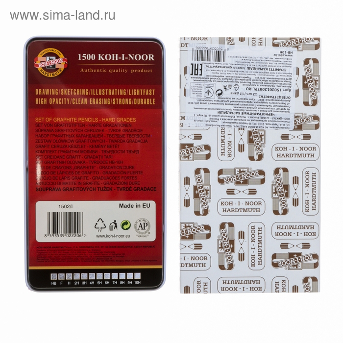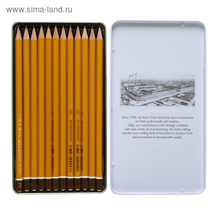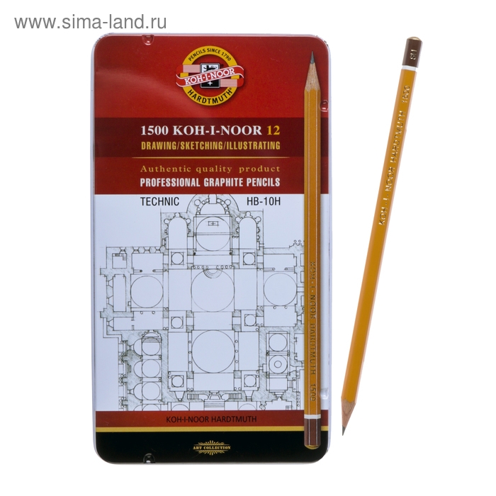Набор карандашей чернографитных разной твердости 12 штук Koh-I-Noor 1500, HB-10H, в металлическом пенале