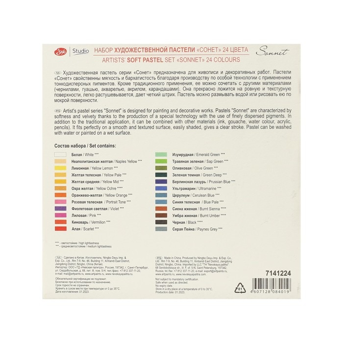 Художественная пастель "Сонет" предназначена для живописи и декоративных работ. Произведена по особой технологии с применением тонкодисперсных пигментов, благодаря чему пастельный штрих мягкий, бархатистый, легко ложится и растушевывается на основе. Чистые интенсивные цвета пастели отлично смешиваются между собой, позволяют добиваться плавных переходов и градиентов. Кроме традиционного применения, ее можно сочетать с другими материалами (чернилами, гуашью, акварелью, акрилом, карандашами), а также размывать водой или рисовать по мокрой поверхности. Представлена в наборах по 12, 24, 36 и 48 цветов, а также двумя тематическими наборами "Графика" и "Земляные тона".