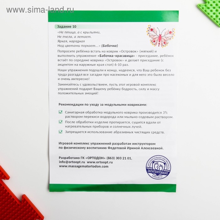 Ортопедическое напольное покрытие состоит из отдельных модулей, которые соединяются между собой по принципу пазла. По массажному коврику можно ходить или выполнять упражнения, стоя на нём. Во время занятий стимулируются рецепторы на стопе и формируются её физиологические своды. Изделие применяется для профилактики плоскостопия у детей, массажа стоп и снятия усталости ног.