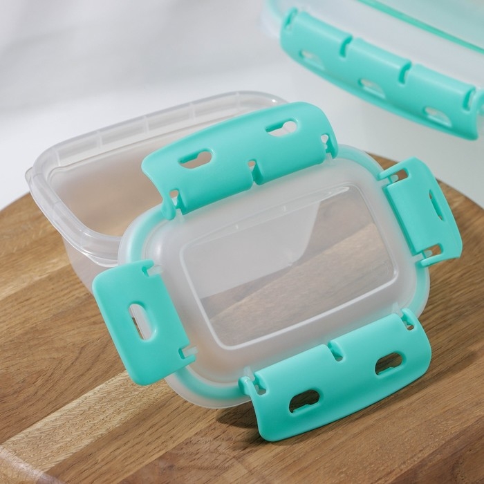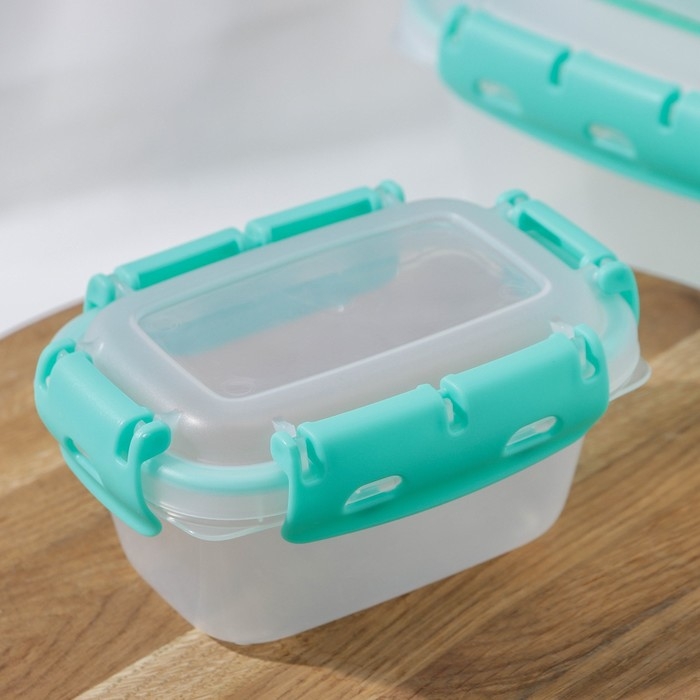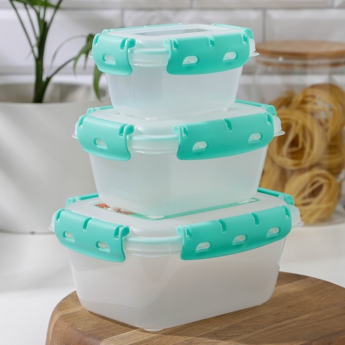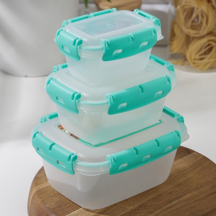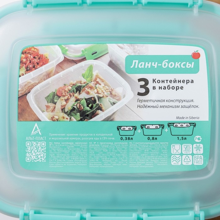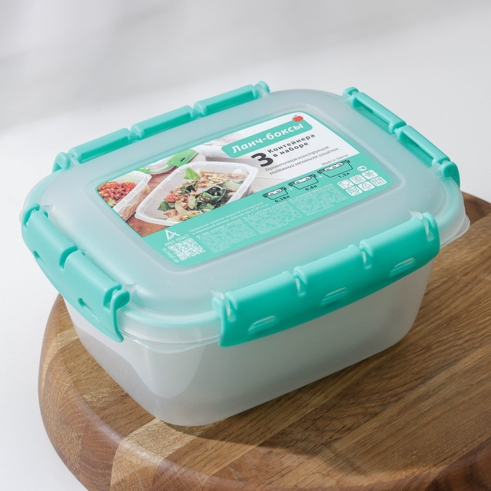 Набор пищевых герметичных контейнеров, 3 шт: 380 мл, 0,8 л, 1,5 л, прозрачные, крышка голубая