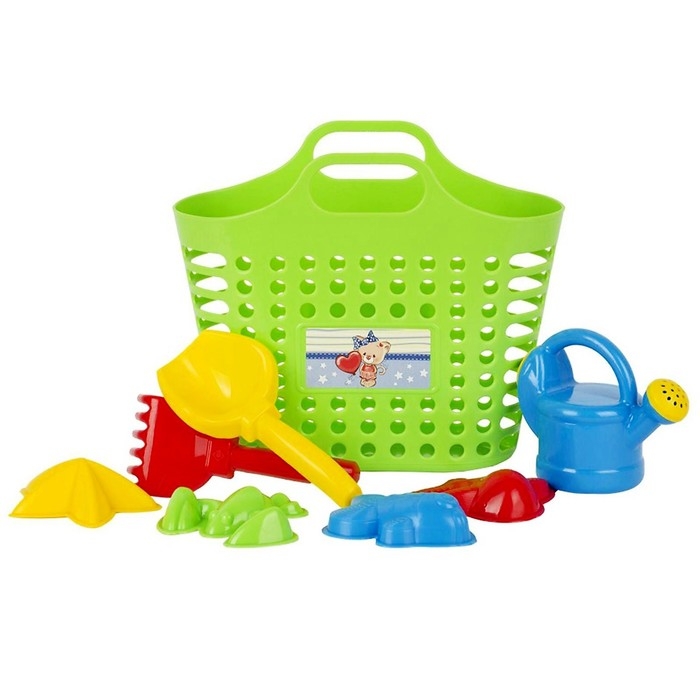Песочный набор из 8 предметов: сумка-корзина, лейка-мини 0,5 Л, совок L16см. грабли, формочки 4 шт.