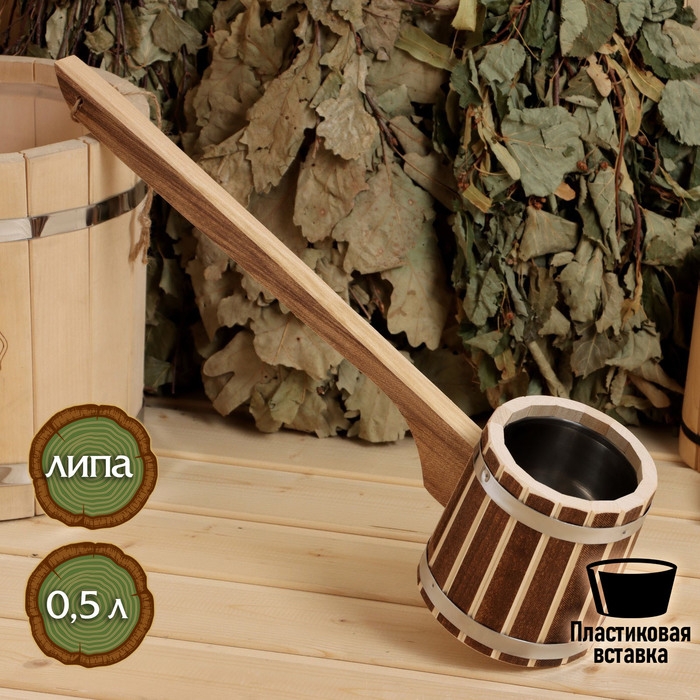 Ковш для бани из липы "Емеля", 0.5л, 54 см, нержавеющая вставка, с длинной ручкой