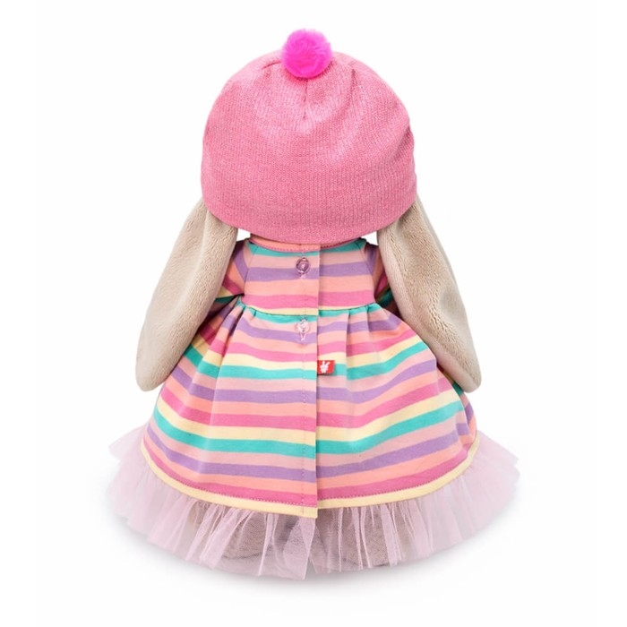Милая мягкая игрушка «Зайка Ми» — это хороший подарок для ребёнка или кукольного коллекционера. На зайке трикотажное платье в полоску, которое сочетается с разноцветным леденцом, на голове розовая шапочка. Все элементы одежды снимаются.