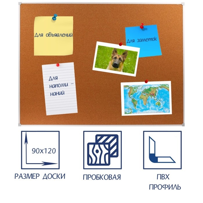 Информация крепится к доске при помощи булавок или силовых кнопок.Есть возможность горизонтального и вертикального расположения на стене.