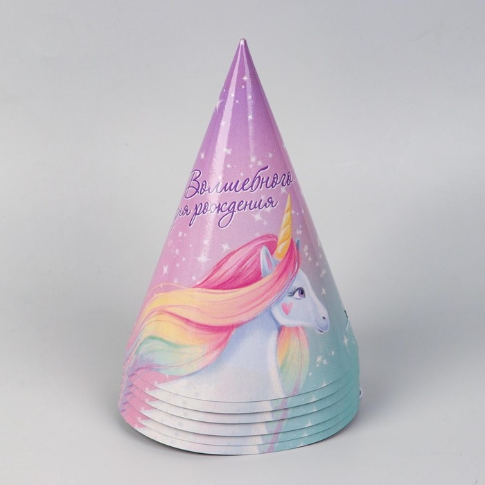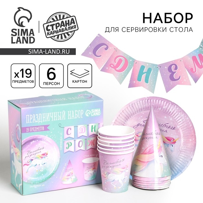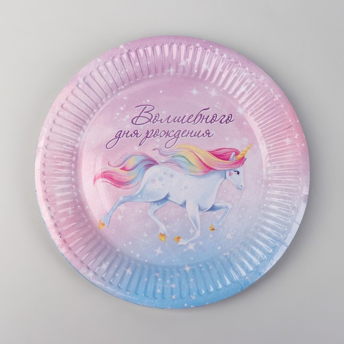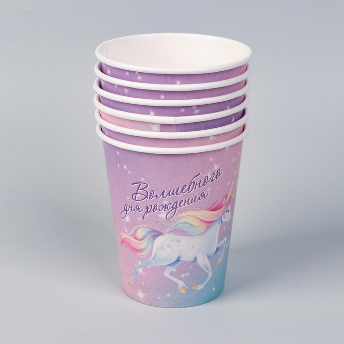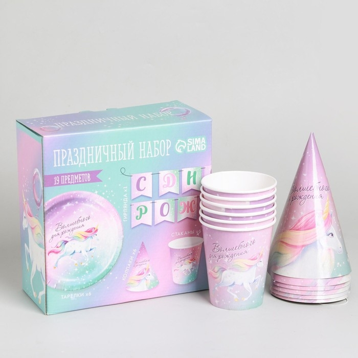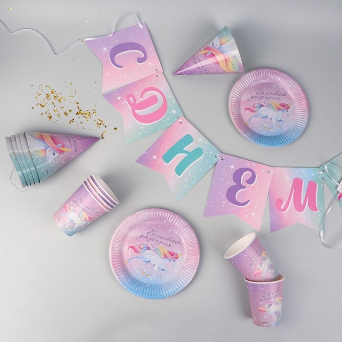 Набор бумажной посуды одноразовый Волшебного дня рождения. Единорог», 6 тарелок, 6 стаканов, 6 колпаков, 1 гирлянда