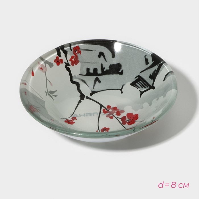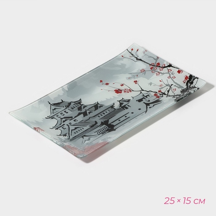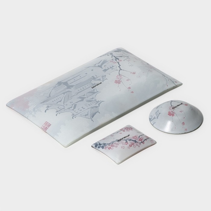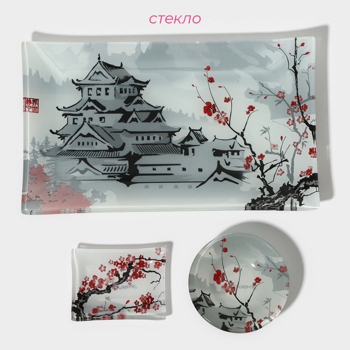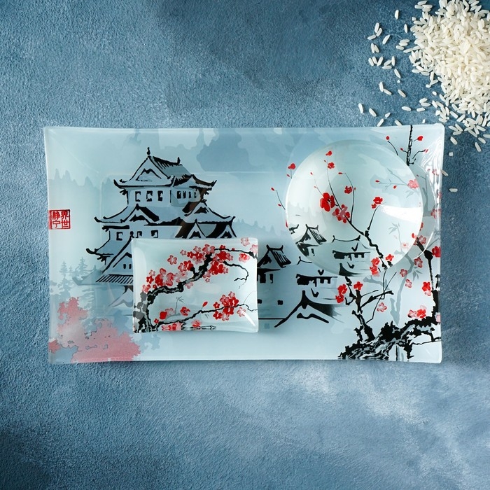Набор для суши из стекла Доляна «Пагода», 3 предмета: соусники 8×2 см, 8×6 см, подставка 25×15×2 см