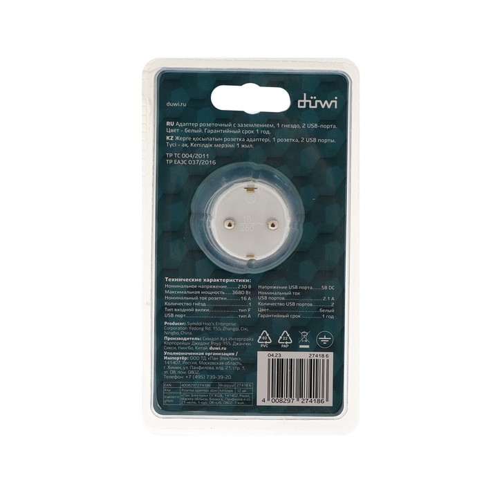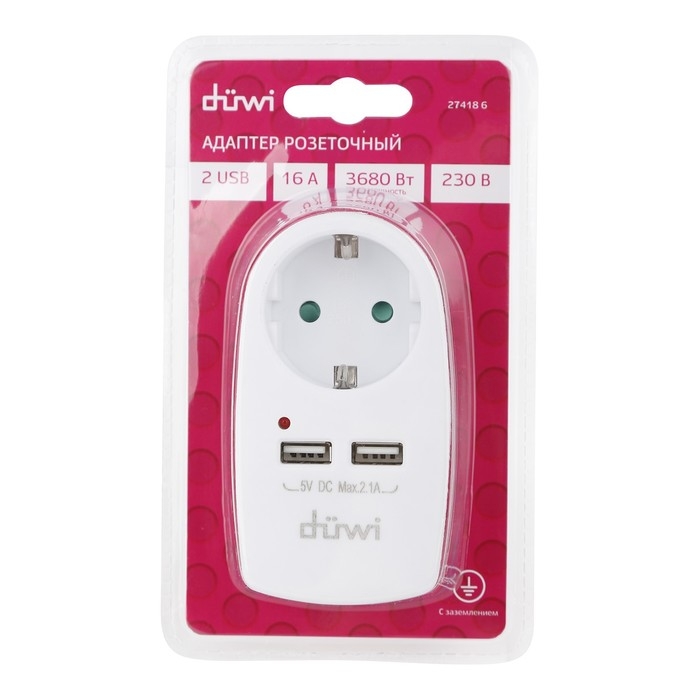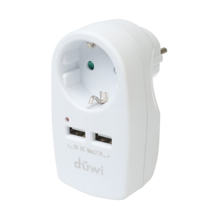 Адаптер 1 гнездо + 2 USB порта на европейскую вилку с/з 16A 230В 3680Вт IP20 белый 27418 6,